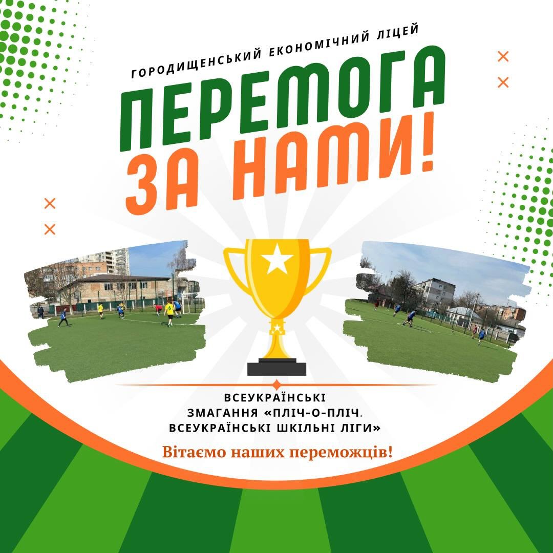 Збірна команда Городищенського економічного ліцею (9–11 кл.) стала тріумфатором зональних змагань із футболу (міні-футболу) в межах проєкту «Пліч-о-пліч. Всеукраїнські шкільні ліги» серед закладів освіти Черкаського району!