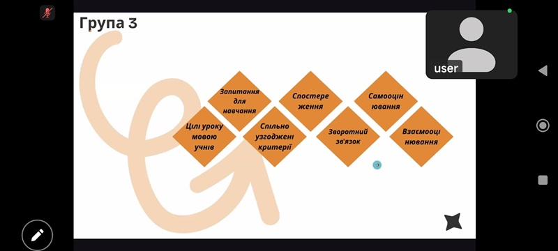 Захід організовувала ГО "Твої кроки". Спікерка Ольга Невтира (вчитель-практик) поділилася досвідом упровадження формувального оцінювання у своєму закладі освіти. Учасникам також було запропновано попрацювати в динамічних групах. Під час обговорень дізнавалися, як формулювати цілі уроку мовою учнів, використовувати формувальне оцінювання для підтримки навчального поступу, застосовувати самооцінювання та взаємооцінювання, надавати ефективний зворотний зв’язок (feedback), створювати власний маршрут оцінювання для уроків.