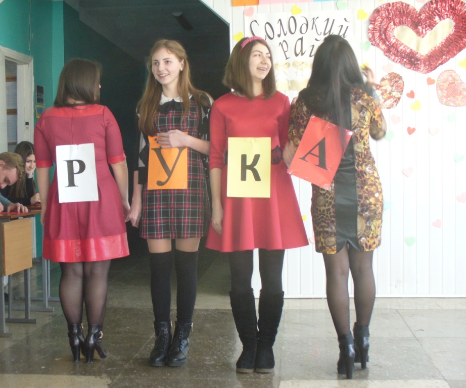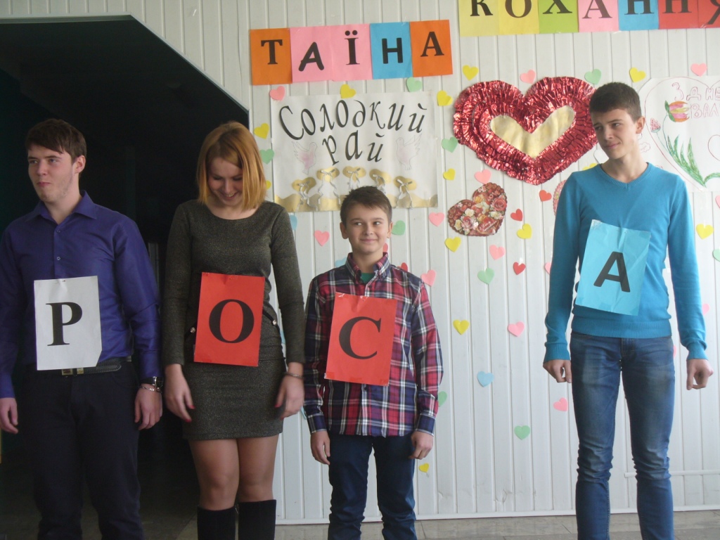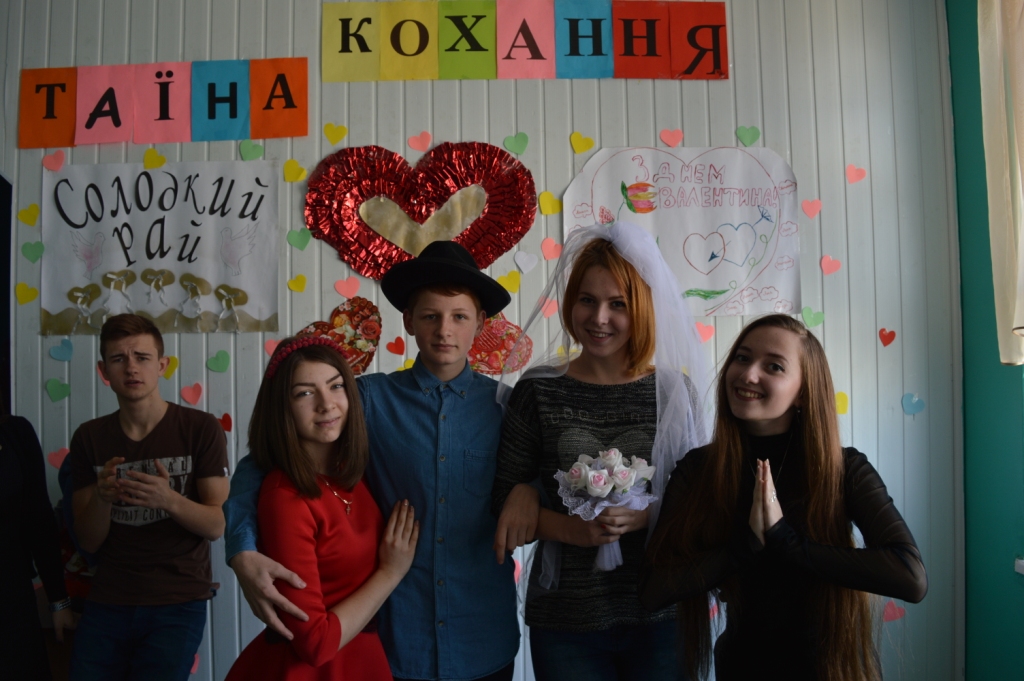 Учні десятого класу підготували для ліцеїстів конкурсно-розважальну програму «Таїна кохання». Ведучі Брушневська Інна та Лисенко Юрій розповіли багато цікавої та нової інформації про День святого Валентина. У конкурсах брали участь шість пар, які пройшли низку випробувань, а оцінювали їхню активність, креативність, кмітливість журі: Здоренко Ж.І., Осадча Ю.П., Галич О.В., Марченко О.Є., Гудзь Л.В. Усі учасники по-своєму були прекрасні та отримали винагороду: Маштабей Владислав та Гейко Дарія, у номінації «Містер та Міс Впевненість», Савенко Аміна та Зінченко Панас отримали титул «Міс та містер Ніжність», Котенко Юлія та Попов Максим - «Міс та містер Кмітливість», Дудник Інна та Петренко Дмитро - «Міс та містер Поетичність», Охріменко Марина та Гнатенко Анна - «Міс Талановитість». Переможцями «Міс та містер Романтичність» стали Назарян Маріанна і Романенко Ілля (10-Б клас), вони ортимали сувеніри та солодкі подарунки.