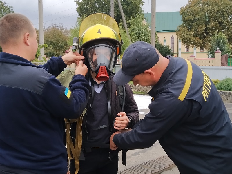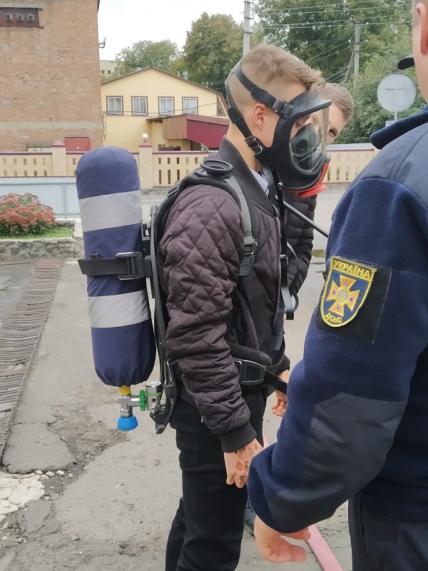 Учні мали можливість поміряти захисне спорядження пожежників, відчути себе справжніми вогнеборцями. Ми залюбки фотографувались біля машин. Та найбільше учнів вразили відвідини гаража з технікою та устаткуванням. Неймовірне здивування і захоплення викликала демонстрація гасіння умовної пожежі.