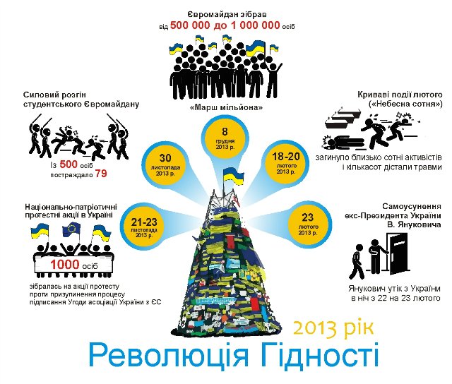 Повстали проти корумпованої влади (не)президента Януковича і його спроб повернути український народ під вплив Росії. Протистояння мирних мітингувальників на Майдані у Києві із владою завершилося кривавою розв'язкою: розстрілом майданівців у центрі столиці. Ті події прискорили перемогу народу над антиукраїнським режимом. Революція гідності перемогла, народ відстояв своє право і прагнення рухатися до побудови цивілізованого європейського суспільства. А в пам'яті нашій назавжи живі герої Майдану - герої Небесної сотні, які полягли з вірою в справедливість, честь і гідність.