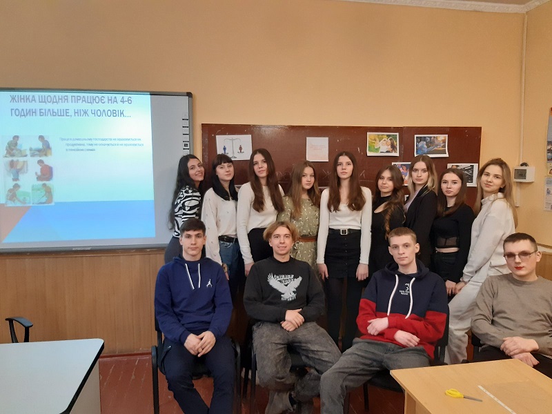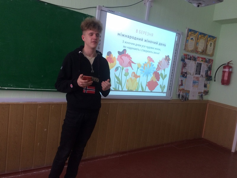 - у 10 класі відбулося ток-шоу «МИ». Для підготовки до дискусії учні прослухали подкаст «Життя в серванті», створений The Ukrainians та IREX у межах проєкту «Вивчай та розрізняй: інфомедійна грамотність». Серед питань, обраних для обговорення, найбільше зацікавлення учнів викликали такі: «Рух за жіночі права. Фемінізм. Й що робити чоловікам?; яким чином 8 березня, день за права жінок, перетворився на «свято весни, краси та жіночності?; які ідеологічні смисли Радянський Союз закріпив у святкуванні цих днів? Як розуміння історії й сутності цих традицій сприяє їх переосмисленню та спонукає до змін? Чи мусить бути день, що привертає увагу до прав жінки? Дискусія супроводжувалася театичними ілюстраціями різних років, що сприяло кращому розумінню теми. Одноголосно прийняли рішення, що має бути день, що привертає увагу до прав жінок та привітали дівчаток класу зі святом;