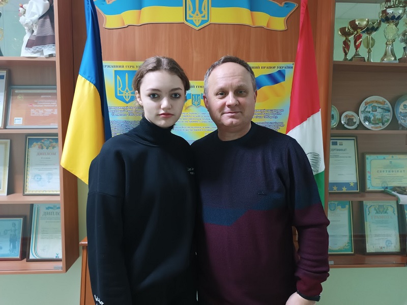 На фото поруч її вчитель - Олександр Олександрович Муха, який має неабиякий досвід підготовки саме учнів-переможців. Тож творчий тандем вчитель-учениця і цього разу досяг успіху.