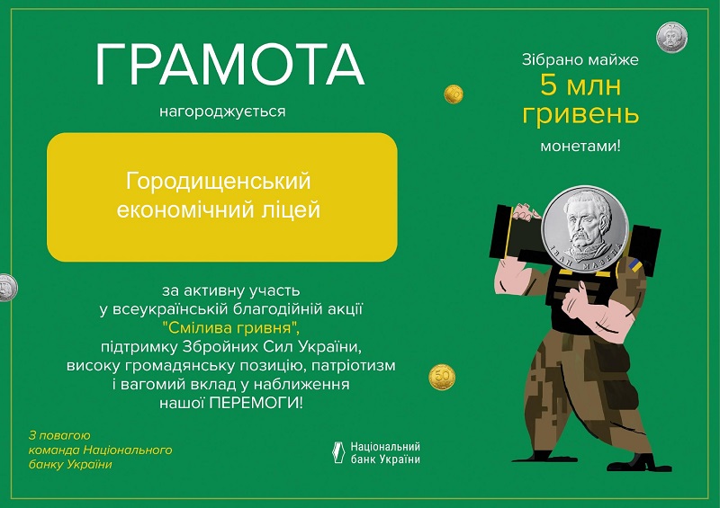 Всеукраїнський проєкт "Смілива гривня" успішно завершився. Над реалізацією проєкту упродовж вересня- жовтня працювали ліцеїсти, їх батьки та педагоги, долучившись до збору монет на підтримку Збройних Сил України та об’єднавши зусилля заради наближення нашої перемоги. Адже ми розуміємо, що кожна монета - це можливість підтримати наших відважних воїнів!!!