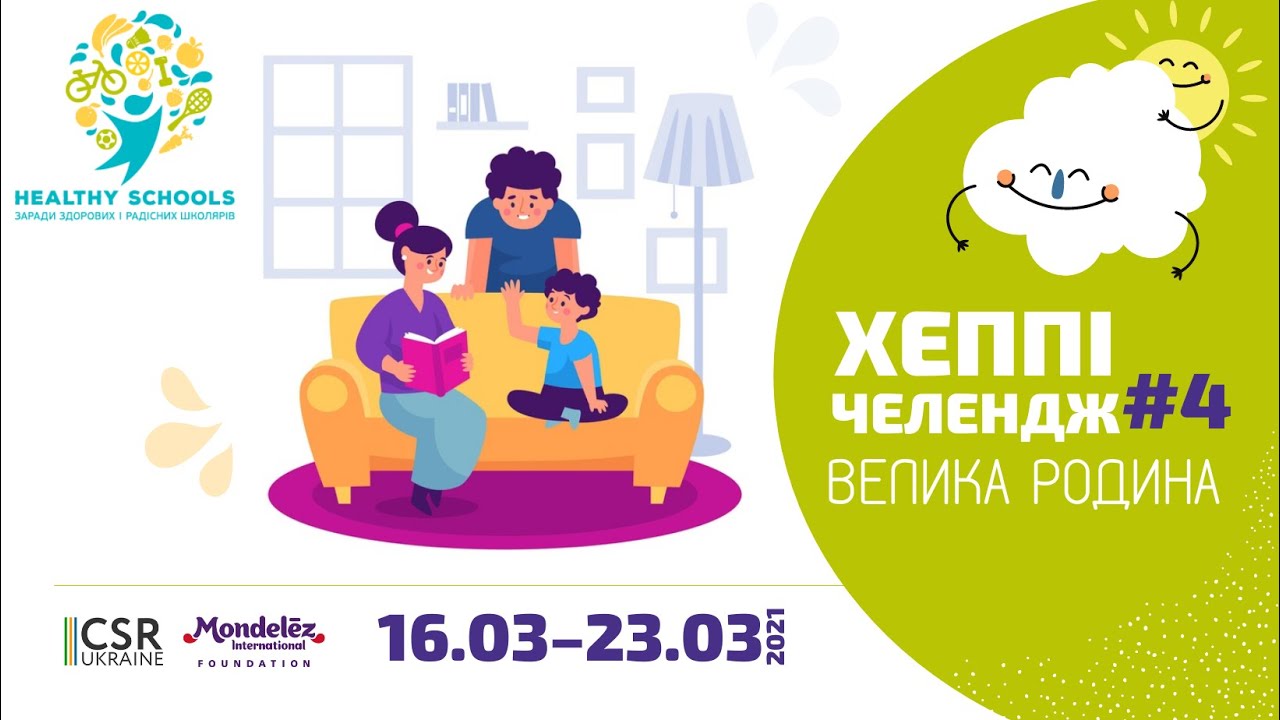 Триває 4 тиждень Хеппі челенджу #Велика родина  проєкту Healthy Schools: заради здорових і радісних школярів. Мета цього тижня - згуртувати дітей з їх батьками, посприяти емоційному зближенню всередині родин, а також підсилити почуття приналежності у дітей до їх великої шкільної родини і до своєї місцевої громади. Всі великі справи починаються із першого кроку, а найважливіші зміни відбуваються у нашому серці.
